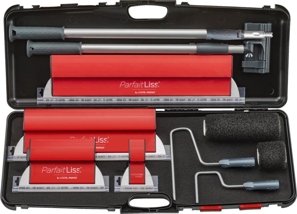Pour lisser l’enduit proprement et uniformément sur les plaques de plâtre, il y a la valise ParfaitLiss Finition de L’Outil Parfait. Cette mallette de 8 pièces contient tout le nécessaire :
