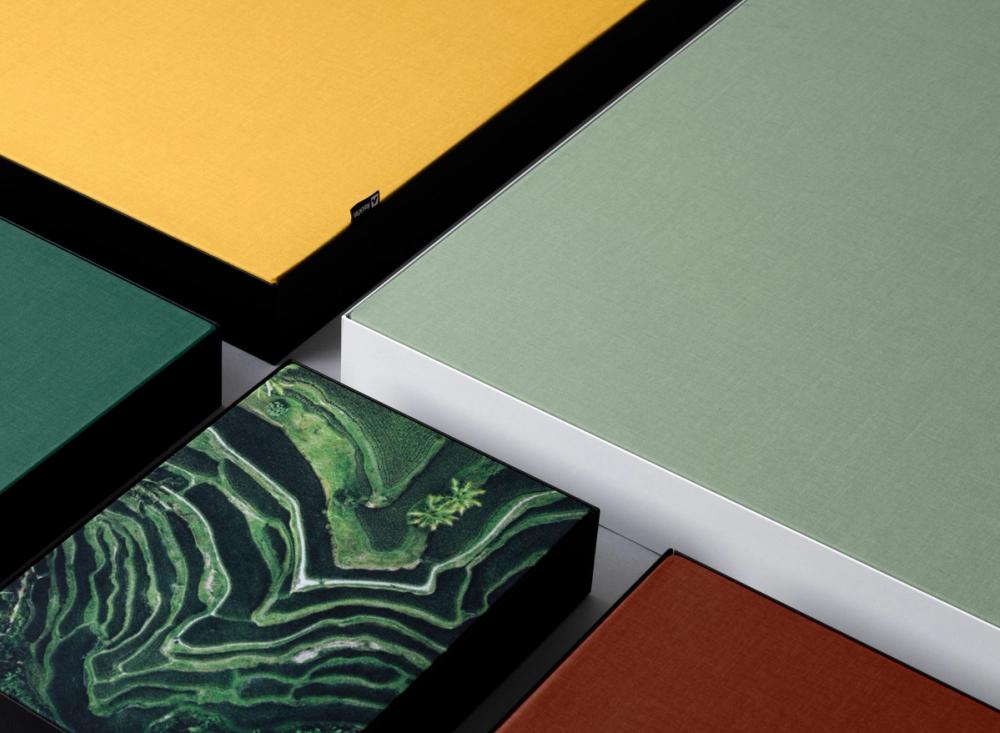 Le cœur des panneaux est constitué de 35 mm de laine de roche. Avec une classe A d'absorption acoustique, ce matériau figure parmi les meilleurs du marché. Côté durabilité, le système tient également ses promesses. La laine de roche est entièrement recyclable. De plus, le cadre des panneaux Canva est composé à 75 % d'aluminium recyclé et la toile textile à 100 % de polyester recyclé.