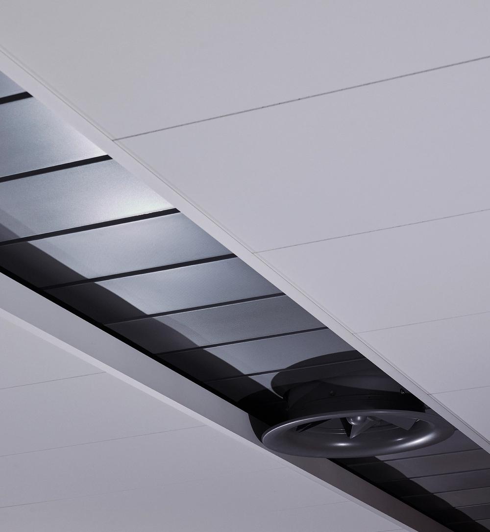Côté design, OneFrame est également un excellent choix. Le cadre est disponible en blanc mat et noir mat. Il se combine avec des panneaux de plafond plats, inclinés ou cachés (finition des bords A, E ou X) montés dans un système de suspension assorti. Pour les panneaux avec la finition des bords Dznl (cachés), vous utilisez des profilés en Z montés dans le cadre. Un expert B+M vous aide à faire le bon choix.