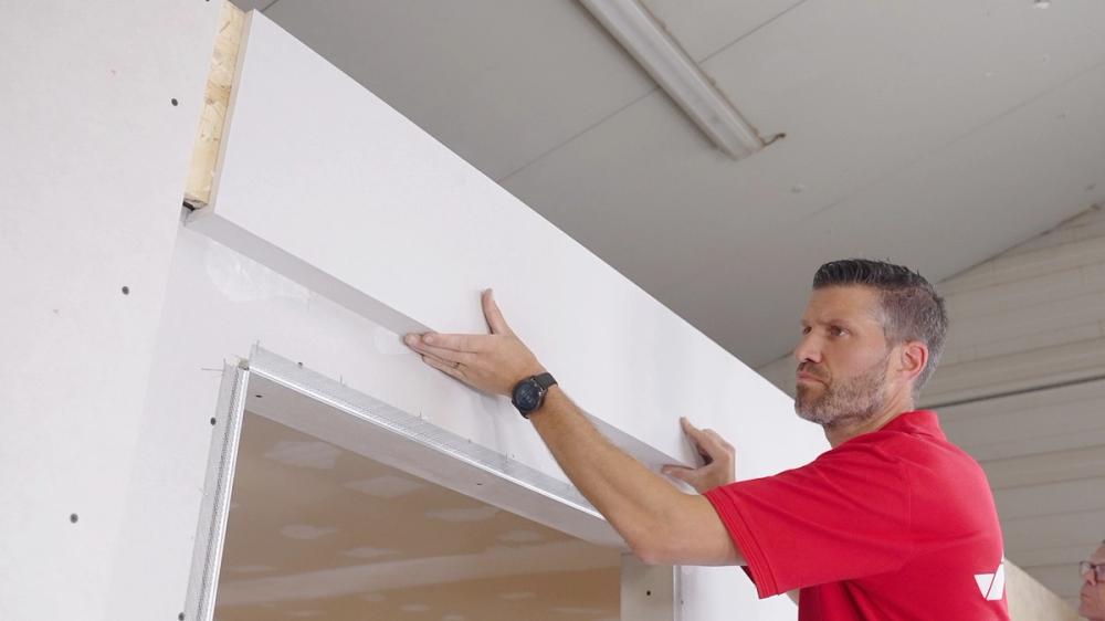 In de productieomgeving van Jansen Prefab wordt alles tot in de puntjes voorbereid. De producent voorziet de gipskartonplaat van een licht schuine infrezing over de hele lengte. Daarin wordt het pleisterprofiel verlijmd. De open voeg tussen het profiel en het gipskarton wordt daarna opgevuld met een elastisch blijvend voegmiddel. Zo kan je sneller afwerken. Een likje verf en klaar!